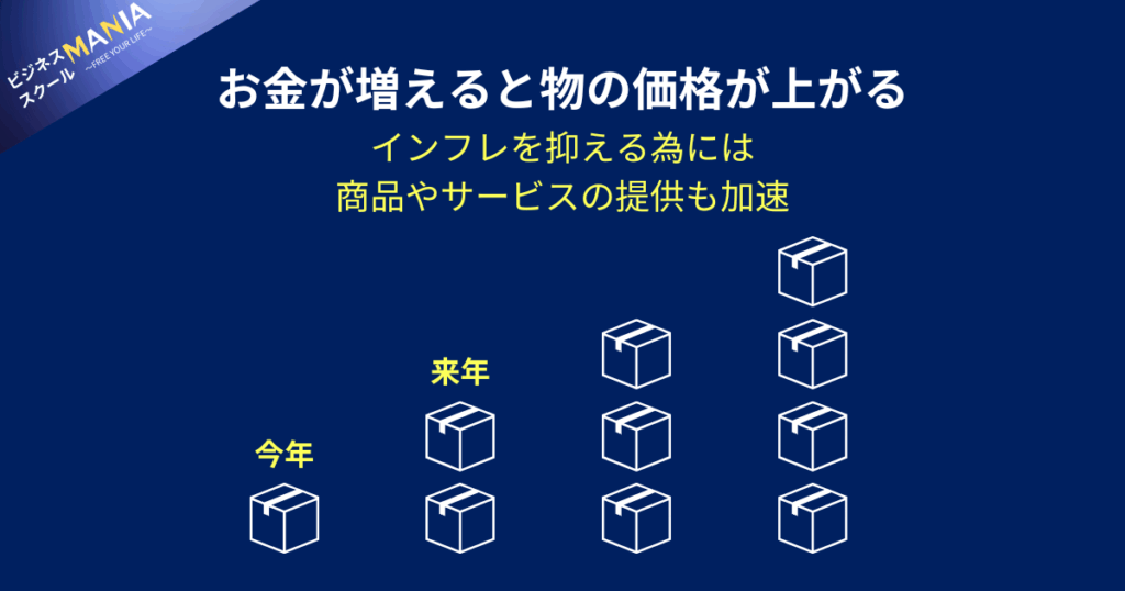 結果、お金の価値が下がり、モノの値段が上がる(インフレ)という現象が起こります。