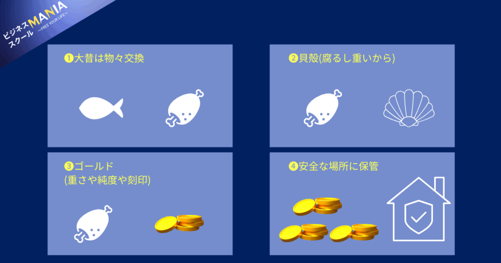 昔はお米や魚などを直接交換していましたが、腐ったり重かったりして不便でした。